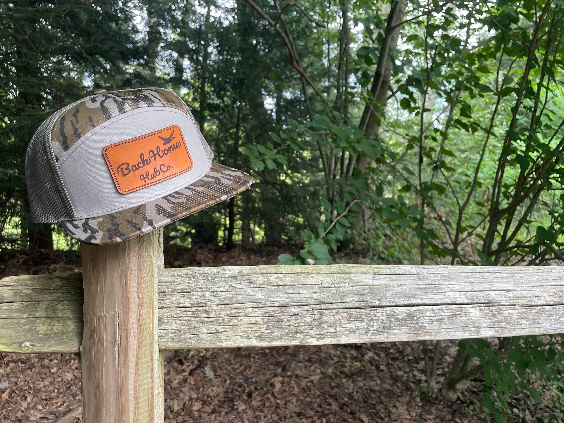 The Original Back Home Hat Co. Hat Features a Quality 7 Panel Hat With A Leather Patch Sewn On, And Our Quality Logo Engraved Onto The Patch.